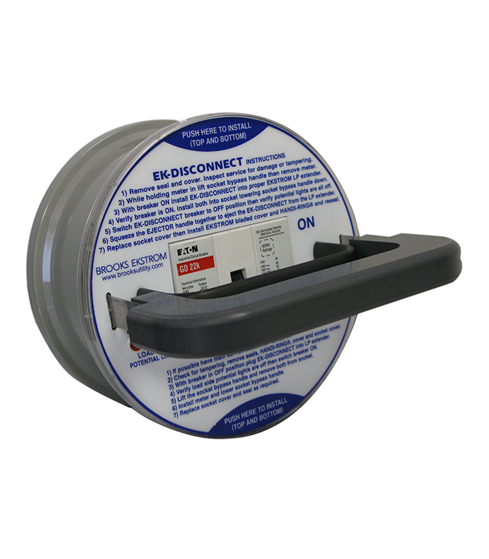 Safely and easily disconnect and reconnect customer electrical service by bypassing meter sockets under load. Load-side indicators warn of unwanted potential, eliminating the risk of possible faults during reconnecting. A patented ejector handle and high-fault-interrupt circuit breaker ensure safe, quick, and proper removal. Available as a complete kit including EK Disconnect device, LP Series adapters, sealing rings, bladed covers, and convenient equipment bag.
